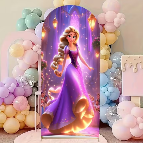 Pack de alquiler de decoración temática Rapunzel con montaje visual completo para tu evento. Incluye estructuras decorativas y elementos para mesa dulce, todo listo para usar, con envío y recogida incluidos.
